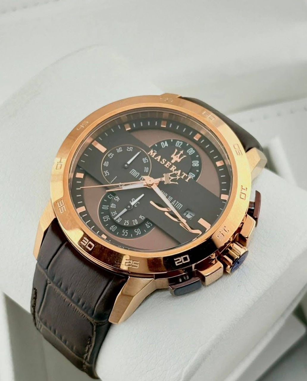 Ce chronographe Maserati conjugue la force du design automobile italien et l’élégance horlogère. Le cadran brun-chocolat aux reflets profonds et le boîtier or rose créent un contraste saisissant.